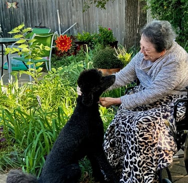 Engaging with therapy dogs can also provide valuable physical and mental stimulation. Taking the dogs for walks, playing with them, or simply caring for them can help improve mobility, coordination, and cognitive functions. For seniors in assisted living facilities, these activities can promote a sense of purpose and fulfillment, contributing to their overall well-being. We had a resident at Abiding Joy Senior Home who insisted on growing out his nails a bit because he said the dogs appreciated the better scratches. We have also had residents who feel purpose when they "dog sit", keeping track of one of the dogs for an hour.